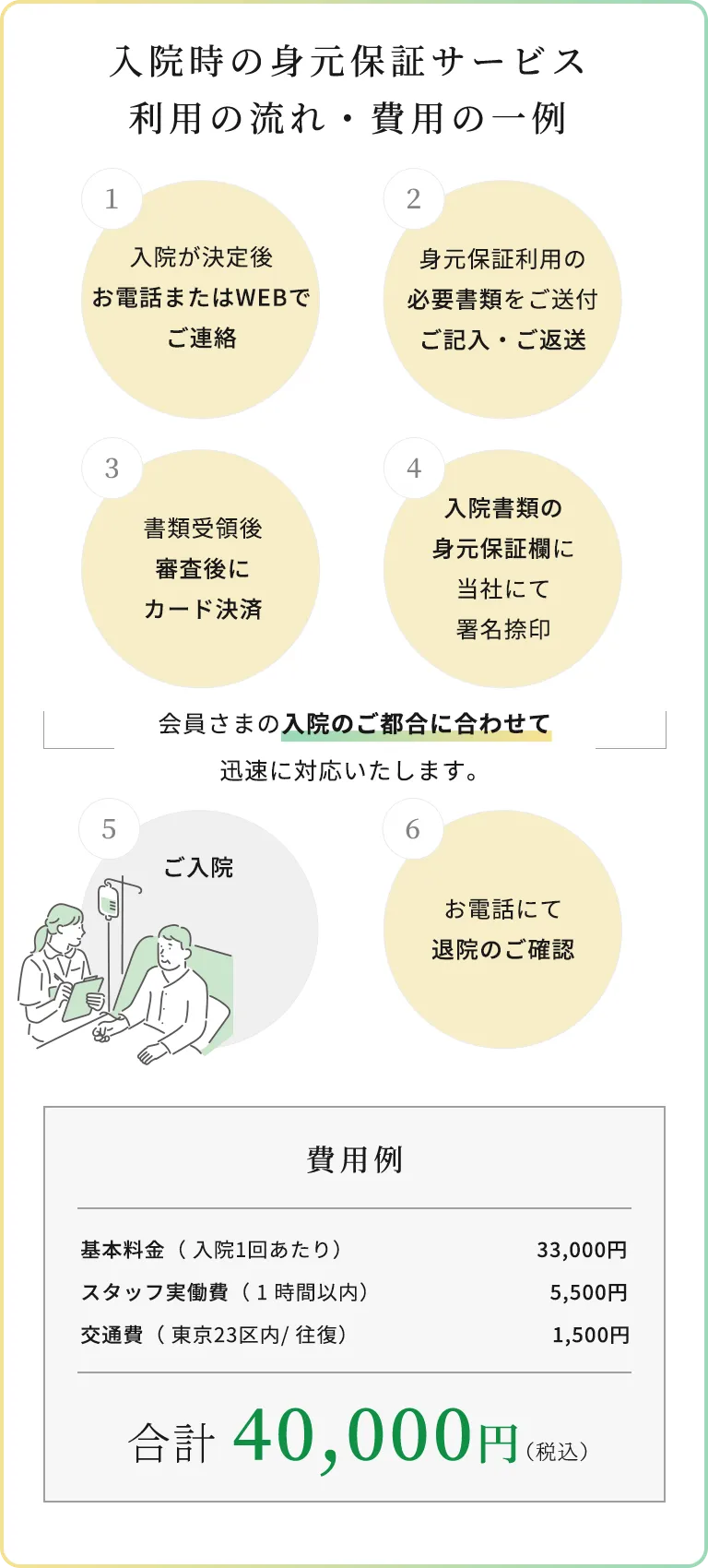 入院時、ご家族・ご親族に代わり「身元保証人」をお引き受けいたします。※賃貸契約、就職、各種ローン等の身元保証には対応しておりません。