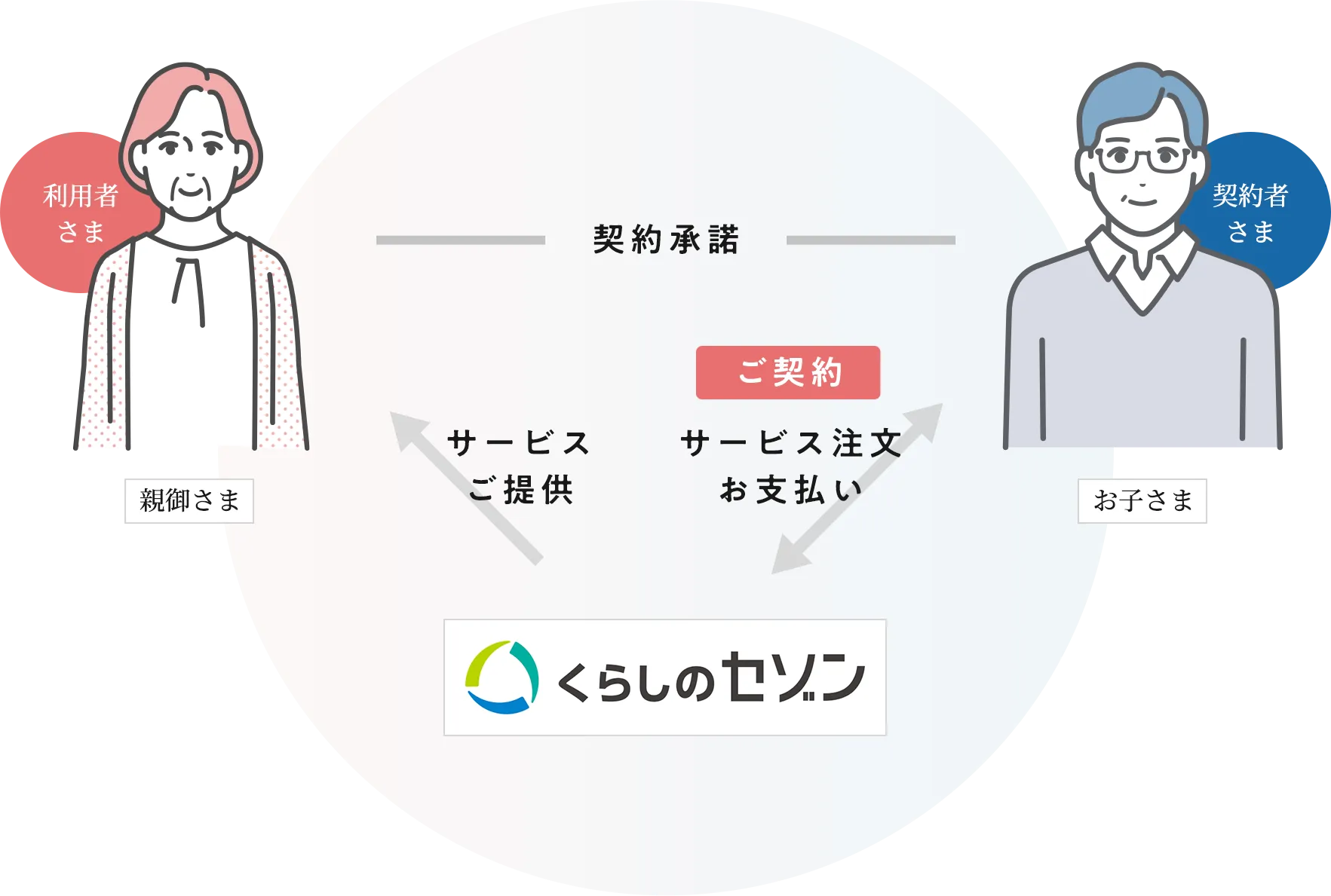 親サポセレクトの契約者はお子さまです。お子さまからサービスをご注文ください。ご注文いただいた内容に沿って利用者の親御さまにサービスをご提供します。サービス利用後、お子さまより利用料のお支払いをお願いします。